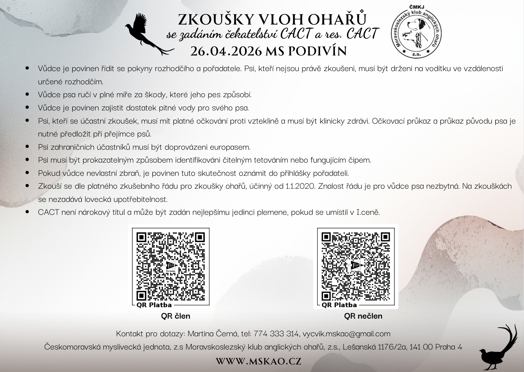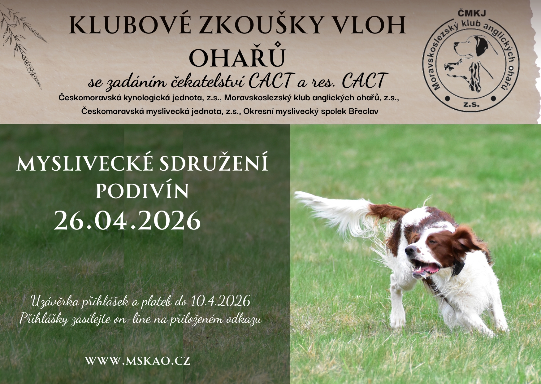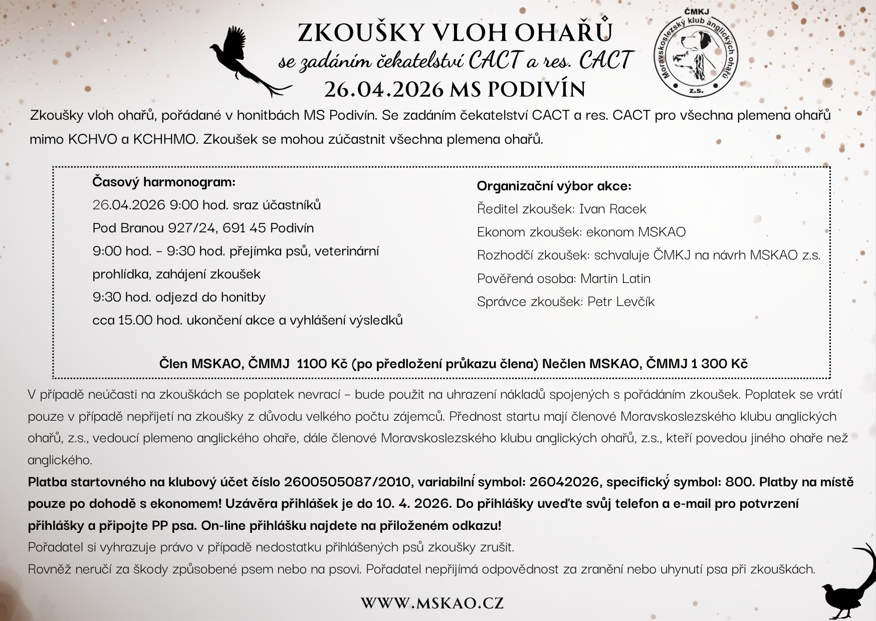 MSKAO vás zve na Klubové zkoušky vloh 26. 4. 2026. Pro přihlášení prosím použijte online přihlášky na tomto odkazu: https://docs.google.com/forms...